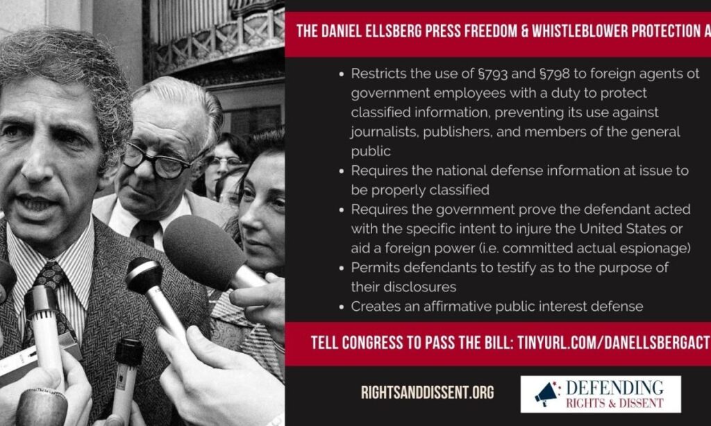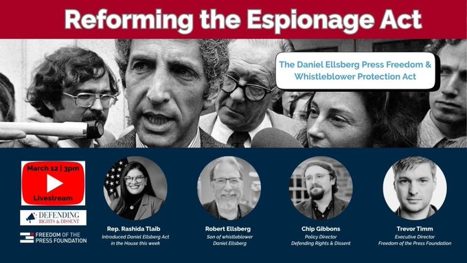 Une très grande nouvelle, nous avons souvent parlé de l’Espionage Act de 1917, loi en vertu de laquelle Julian Assange a été condamné, la protection du Premier Amendement lui ayant été refusée car n’étant pas citoyen des Etats-Unis (on peut souligner à nouveau l’ironie avec laquelle les Etats-Unis étendent certaines de leurs lois au monde entier – enfin à cette part du monde qui leur résiste- mais n’accordent pas une possible protection). Nous savions que des membres du Congrès et des associations (Defending Rights and Dissent) voulaient faire réformer cette loi et ainsi mettre fin aux abus à l’encontre des lanceurs d’alerte et des journalistes. La réforme de la loi a été présentée le 12 mars par la représentante au Congrès Rashida Tlaib. Son nom : Daniel Ellsberg Press Freedom and Whistleblower Protection Act.